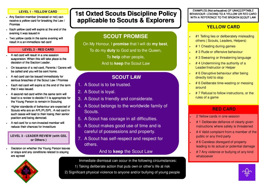 The policy outlines examples of unacceptable behaviour and the Scout Laws that would be broken. In addition it outlines the use of red and yellow cards to help manage unacceptable behaviour and the discipline that will be put in place as a consequence of receiving the yellow and red card. To download the PDF please click the following link